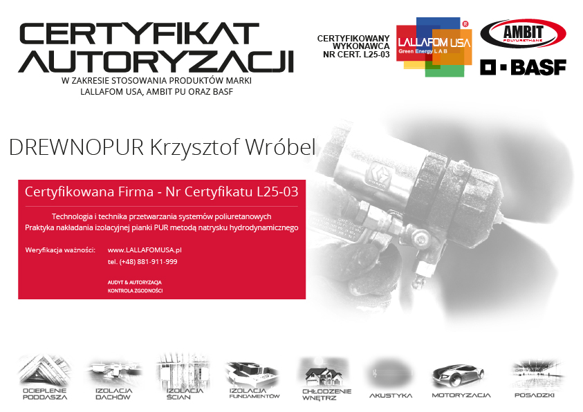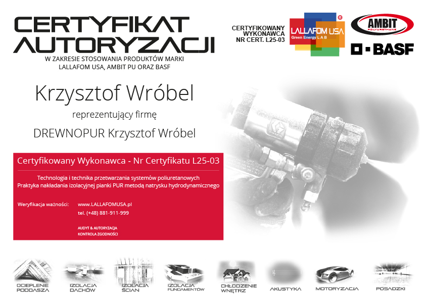 Oryginalne pianki LALLAFOM® USA są do nabycia wyłącznie u Autoryzowanego, Certyfikowanego Wykonawcy. Jeżeli otrzymasz ofertę na te produkty z innego źródła lub będziesz miał jakiekolwiek wątpliwości, skontaktuj się z Przedstawicielem LALLAFOM® USA w Polsce, dzwoniąc pod numer +48 881 911 999 lub wysyłając e-mail na adres info@LALLAFOMUSA.com. Zweryfikujemy wówczas dla Ciebie autentyczność oferowanego Ci produktu oraz kompetencje firmy natryskowej. Bądź świadomy za co płacisz i zapobiegaj łamaniu prawa budowlanego!
